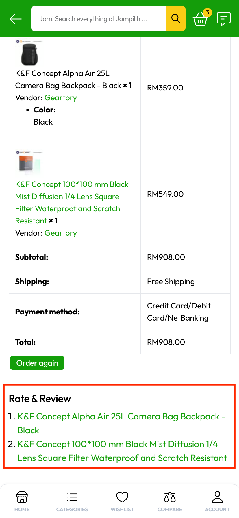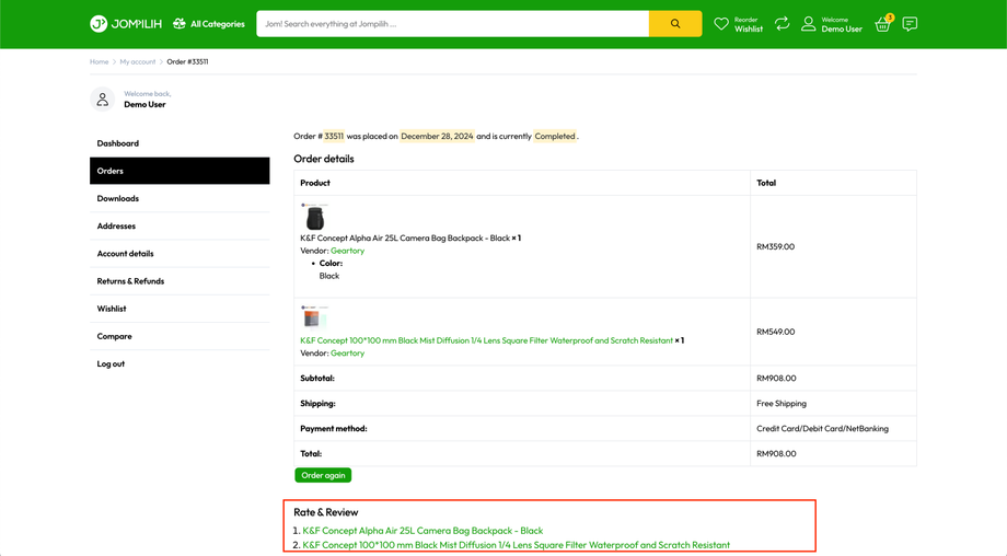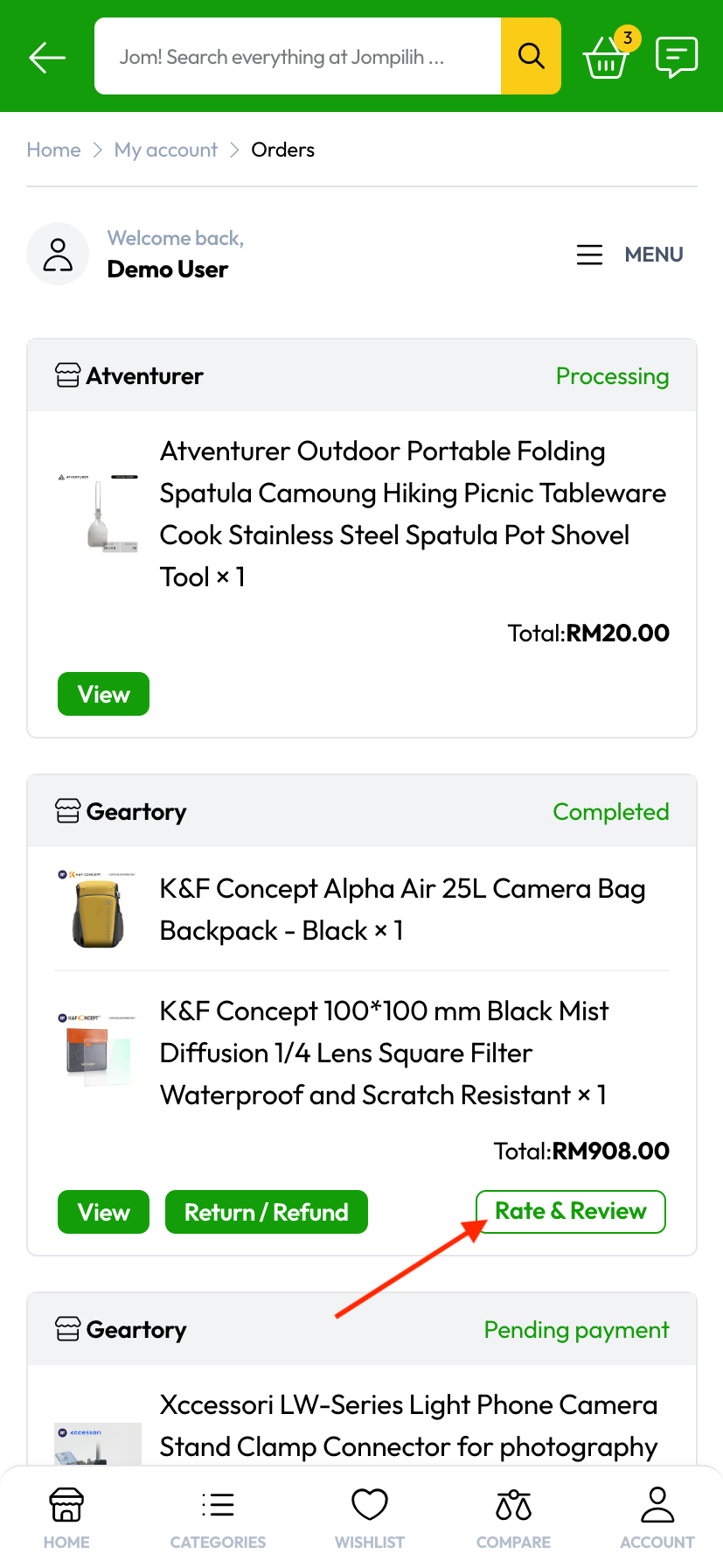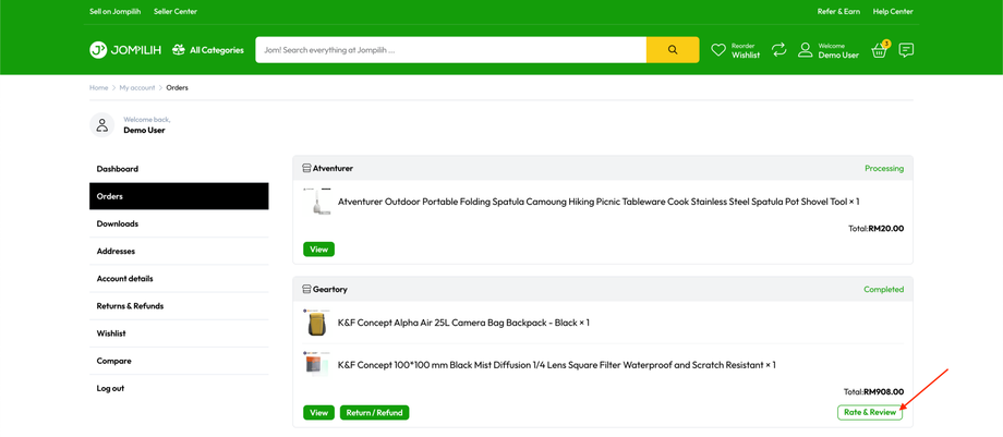 You can rate a product only after the associated order is completed. Orders that have been returned, refunded, or canceled are not eligible for ratings. To rate and review a product, please follow the steps below: