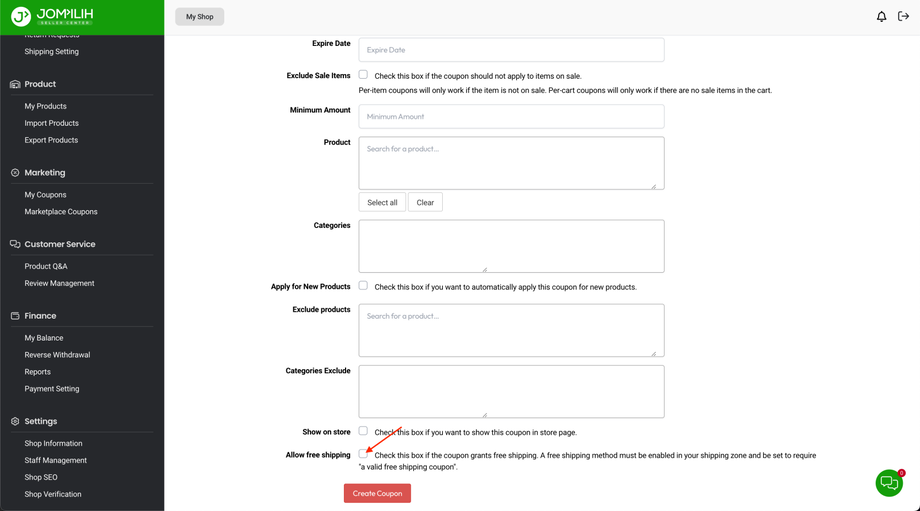 If you offer your customers free shipping with a coupon, follow these steps to create and configure a free shipping coupon:
