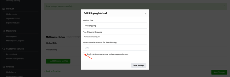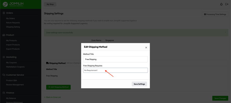 4. Select the requirement that buyers must meet to receive free shipping from the “Free Shipping Requires” dropdown:
