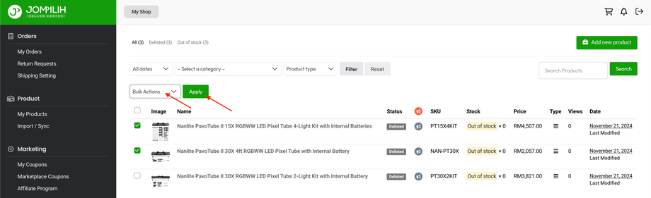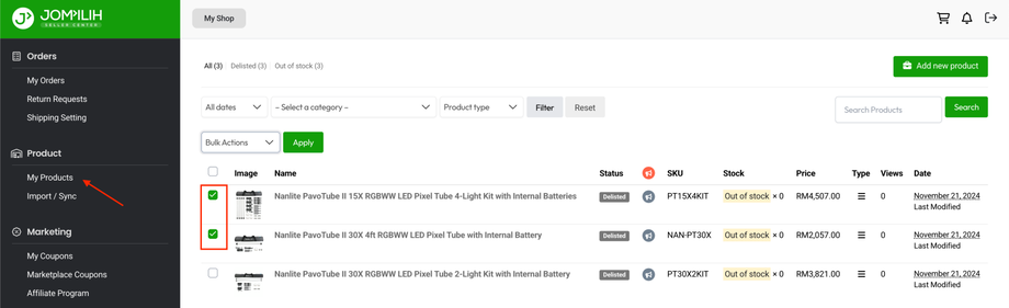 1. Once you have made the necessary adjustments, navigate to Product > My Products. Check on the delisted products that you wish to resubmit.