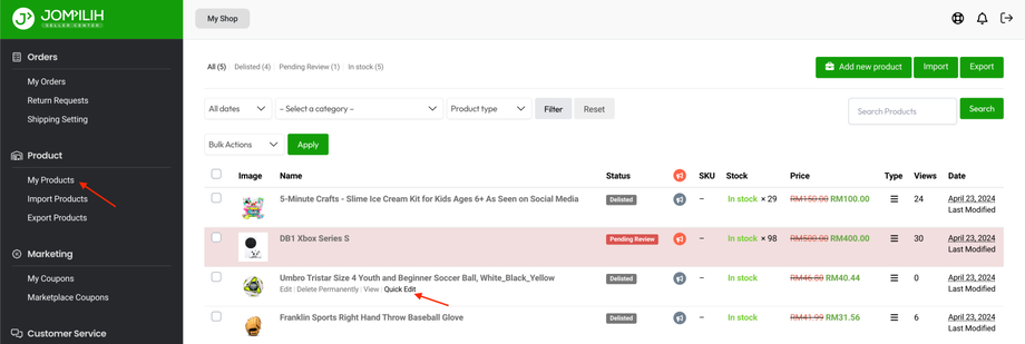 1. Once you have made the necessary adjustments, navigate to Product > My Products. Point over to the delisted product and click on Quick Edit.
