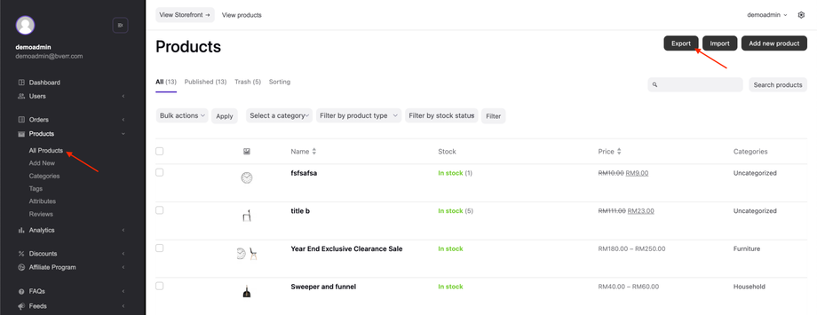 2. Navigate to Products > All Products and click on the Export button.