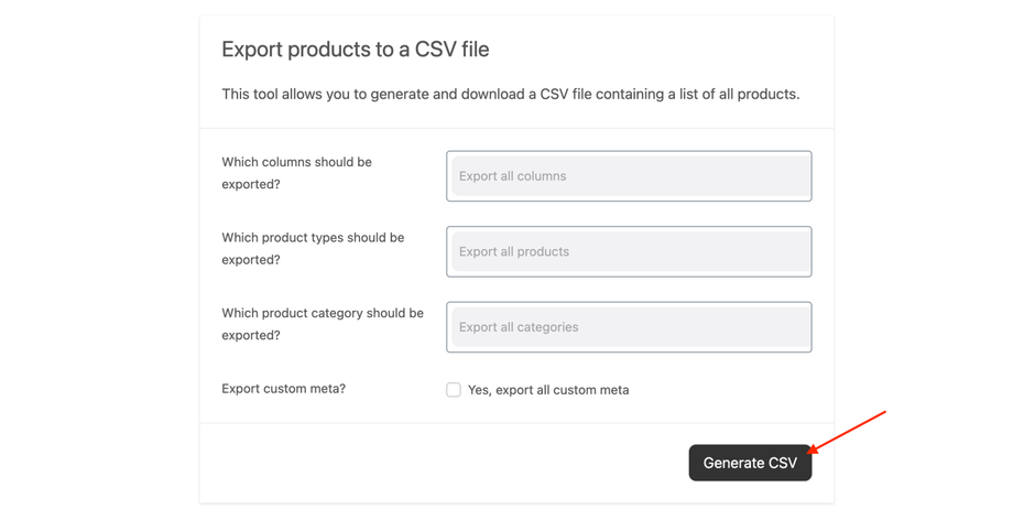3. The Export Products screen will be displayed. Click on the Generate CSV button and wait for the export to finish.