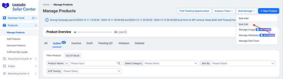 3. On the right side, click on Bulk Manage button and select Bulk Edit.