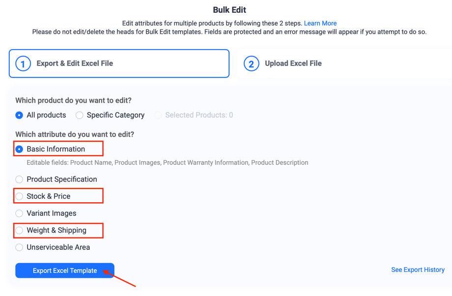 4. Select Basic Information and click on Export Excel Template button. Repeat this step for Stock & Price and Weight & Shipping as well.