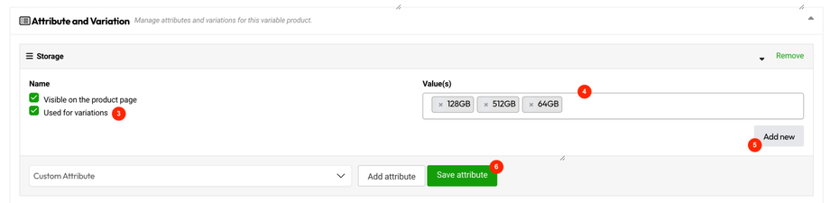 1. Select Custom Attribute, Color, Brand or Storage from the Dropdown field.