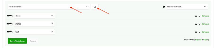 When working with a large number of product variations, editing them all at once is possible click on "Add variation" dropdown menu and select the action that you wish to perform before clicking the "Go" button.